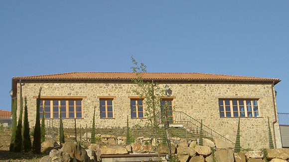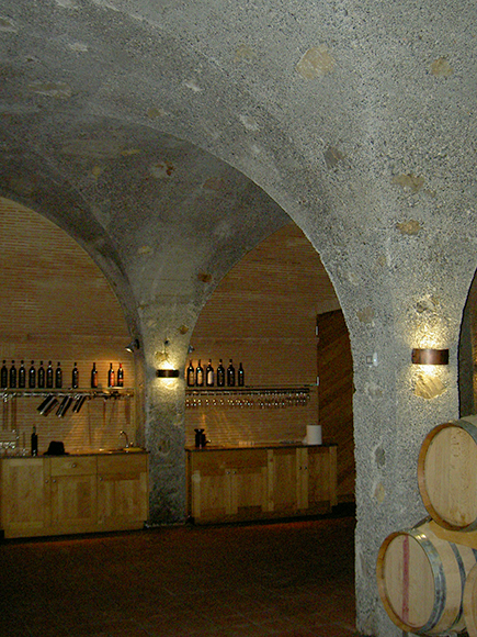 Auf einem Hügel in der Toskana als Brunelloweinkeller neu errichtet. Die Außenmaterialien und Dächer sind von der italienischen Behörde vorgeschrieben. Innen geschieht Raumkühlung durch Erde, in dem die Kellerräume zweistockig unterirdisch angeordnet sind und Erdrohrwärmetauscher eingebaut sind.